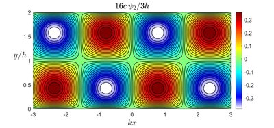 Since each term on the right-hand side is quadratic, it will result in terms with frequencies [math]\displaystyle{ \omega+\omega=2\omega }[/math] and [math]\displaystyle{ \omega-\omega=0. }[/math] The [math]\displaystyle{ \omega=0 }[/math] terms correspond to time independent forcing for [math]\displaystyle{ u_2 }[/math]. Let us find solution that corresponds only to this time-independent part. This leads to [math]\displaystyle{ \psi_2 = \sin 2 kx\, \zeta_2 (y)/c }[/math] where [math]\displaystyle{ \zeta_2 }[/math] satisfies the equation[6]