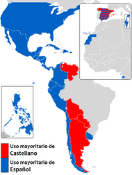 Spanish (español) or Castilian (castellano) is a Romance language of the Indo-European language family that evolved from the Vulgar Latin spoken on the Iberian Peninsula of Europe. Today, it is a global language with about 500 million native speakers, mainly in the Americas and Spain , and about 600 million when including speakers as a second language.[4][5] Spanish is the official language of 20 countries, as well as one of the six official languages of the United Nations .[6] Spanish is the world's second-most spoken native language after Mandarin Chinese;[5][7] the world's fourth-most spoken language overall after English, Mandarin Chinese, and Hindustani (Hindi-Urdu); and the world's most widely spoken Romance language. The country with the largest population of native speakers is Mexico.[8]