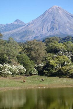 At the very north of the state, the border is marked by two volcanoes. The Colima Volcano, also called the Volcán de Fuego, is active and the Nevado de Colima is not. The Nevado de Colima is taller at 4,271 m (14,013 ft) and gives its name to the national park that surrounds it. The Colima Volcano, 3825 m (12,549 ft), has a pyramidal peak, in contrast to the other, which has been leveled somewhat.[14] The last major eruptions of the Colima Volcano occurred in 1998 and 1999.[15]