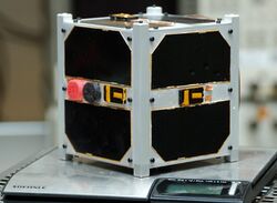 A CubeSat[29] is a common type of nanosatellite,[26] built in cube form based on multiples of 10 cm × 10 cm × 10 cm, with a mass of no more than 1.33 kilograms (2.9 lb) per unit.[30] The CubeSat concept was first developed in 1999 by a collaborative team of California Polytechnic State University and Stanford University, and the specifications, for use by anyone planning to launch a CubeSat-style nanosatellite, are maintained by this group.[30]