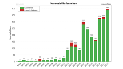 In the ten years of nanosat launches prior to 2014, only 75 nanosats were launched.[26] Launch rates picked up substantially when in the three-month period from November 2013–January 2014 94 nanosats were launched.[35]