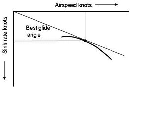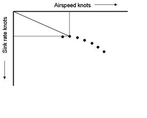 The best speed to fly in a head wind is determined from the graph by shifting the origin to the right along the horizontal axis by the speed of the headwind, and drawing a new tangent line. This new airspeed will be faster as the headwind increases, but will result in the greatest distance covered. A general rule of thumb is to add half the headwind component to the best L/D for the maximum distance. For a tailwind, the origin is shifted to the left by the speed of the tailwind, and drawing a new tangent line. The tailwind speed to fly will lie between minimum sink and best L/D.[2]