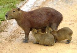 The invasions of South America started about 40 Ma ago (middle Eocene), when caviomorph rodents arrived in South America.[43][44][45] Their subsequent vigorous diversification displaced some of South America's small marsupials and gave rise to – among others – capybaras, chinchillas, viscachas, and New World porcupines. The independent development of spines by New and Old World porcupines is another example of parallel evolution. This invasion most likely came from Africa.[46][47] The crossing from West Africa to the northeast corner of Brazil was much shorter then, due to continental drift, and may have been aided by island hopping (e.g. via St. Paul's Rocks, if they were an inhabitable island at the time) and westward oceanic currents.[48] Crossings of the ocean were accomplished when at least one fertilised female (more commonly a group of animals) accidentally floated over on driftwood or mangrove rafts. Hutias (Capromyidae) would subsequently colonize the West Indies as far as the Bahamas,[49][50] reaching the Greater Antilles by the early Oligocene.[51] Over time, some caviomorph rodents evolved into larger forms that competed with some of the native South American ungulates, which may have contributed to the gradual loss of diversity suffered by the latter after the early Oligocene.[18] By the Pliocene, some caviomorphs (e.g., Josephoartigasia monesi) attained sizes on the order of 500 kg (1,100 lb) or larger.[52]