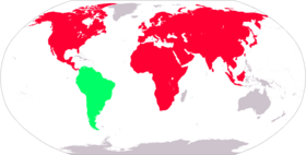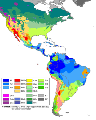 A north–south climatic asymmetry in the Americas: Tropical climate zones, which are warm year-round and moist at least part of the year (blue zones Af, Am and Aw), cover much of South America and nearly all of Central America, but very little of the rest of North America.