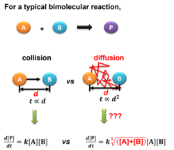 Collision in diluted gas or liquid solution is regulated by diffusion instead of direct collisions, which can be calculated from Fick's laws of diffusion. Theoretical models to calculate the collision frequency in solutions have been proposed by Marian Smoluchowski in a seminal 1916 publication at the infinite time limit,[4] and Jixin Chen in 2022 at a finite-time approximation.[5] A scheme of comparing the rate equations in pure gas and solution is shown in the right figure.