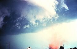 It has been thought in the past that tornadoes moved almost exclusively in a northeasterly direction.[7] This is false, and a potentially deadly myth which can lead to a false sense of security, especially for unaware spotters or chasers. Although the majority of tornadoes move northeast, this is normally due to the motion of the storm, and tornadoes can move in any direction. The expectation of northeasterly travel may be accurate in many cases, but is a statistical observation about the most usual direction of travel that cannot be applied to predict the movement of a particular tornado. A deadly F5 tornado that hit the city of Jarrell, Texas, in 1997 moved to the southwest – directly opposite to the commonly expected storm motion. Another notable example is the 1990 Plainfield tornado, a significant and deadly F5 tornado that traveled from northwest-to-southeast. Tornadoes can also change direction unpredictably due to storm motion changes or effects on the tornado itself from factors such as its rear flank downdraft.[12] A change of direction proved deadly in the 2013 El Reno tornado, in which a 2.6-mile-wide tornado shifted from an easterly to a northeasterly direction, killing four storm chasers.[25] A 2008 tornado in Colorado moved in a southeast-to-northwest direction, which is very rare.[26]