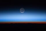 Blue light is scattered more than other wavelengths by the gases in the atmosphere, surrounding Earth in a visibly blue layer at the stratosphere, above the clouds of the troposphere, when seen from space on board the ISS at an altitude of 335 km (208 mi) (the Moon is visible as a crescent in the far background).
