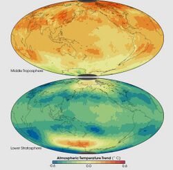 Temperatures drop with increasing altitude to the mesopause that marks the top of this middle layer of the atmosphere. It is the coldest place on Earth and has an average temperature around −85 °C (−120 °F; 190 K).[26][27]