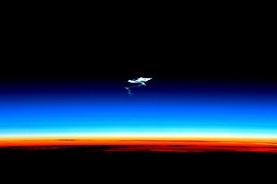 Afterglow of the troposphere (orange), the stratosphere (blue) and the mesosphere (dark) at which atmospheric entry begins, leaving smoke trails, such as in this case of a spacecraft reentry.
