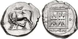 After 323 BC Epidamnus-Dyrrhachium was involved in the intervention in Illyria of the Macedonians under Cassander, who clashed with the Illyrians under Glaukias. In 314 BC the Macedonian king seized the city but the garrison he established there was in turn besieged and driven out by the Illyrian king and the Corcyrans. In 312 BC, after another unsuccessful attack of Cassander in the region, the city came under the protection of Glaukias. Those events marked the end of Macedonian presence on the Adriatic coast for almost one century.[37] The city probably came under the control of Pyrrhus of Epirus at the beginning of the 3rd century BC.[37] From about 280 BC the Illyrian king Monunius, and his successor Mytilos minted in Dyrrhachion silver and bronze coins respectively, bearing the king's name and the symbol of the city.[38] The fact that their coins were struck in the city mint of Dyrrhachion stresses that they exercised to some extent their authority over the city.[39]