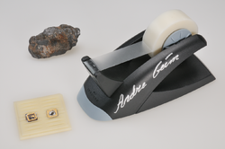 A lump of graphite, a graphene transistor, and a tape dispenser, a tool that was used for the exfolitation of single-layer graphene from graphite in 2004. Donated to the Nobel Museum in Stockholm by Andre Geim and Konstantin Novoselov in 2010.