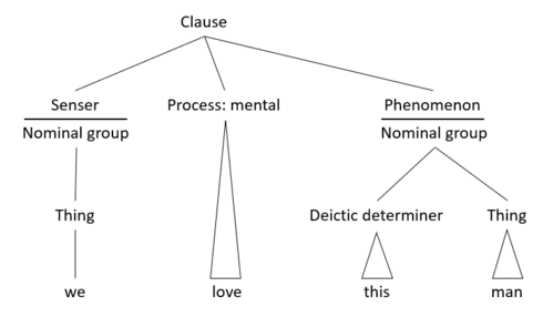 senser. The verb 'love' is analysed as representing a mental process. The pronoun 'this' is a deictic determiner, and the noun 'man' is a thing. These form a second nominal group representing a