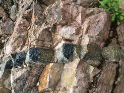 Closely related to intercalated contacts is interfingering (also known as intertonguing,[7] interdigitating, or interlocking[8]) of laterally adjacent sedimentary rock bodies. Here the contact breaks down into a series of wedges or tongues that penetrate the adjacent rock body and pinch out individually. These record fluctuations in the location of the boundary between different depositional environments where sediments were simultaneously being laid down.[8]
