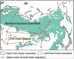 Paleolithic Central Asia was characterized by an distinctive but deeply European-related population (Ancient North Eurasian), with subsequent geneflow from Paleo-Siberians, contributing East Asian-related ancestry towards Paleolithic Central Asians. During the Bronze Age, ancient Central Asia received various migration events from Europe and the Middle East, associated with Indo-Europeans. Bronze Age Central Asia consisted largely of Iranian peoples, with some groups being of Paleo-Siberian and Samoyedic (Uralic) origin. Since the early Iron Age, Central Asia received noteworthy amounts of migration from East Asian-related populations, and became increasingly diverse. The Turkic peoples slowly replaced and assimilated the previous Iranian-speaking locals, turning the population of Central Asia from largely Iranian, into primarily of East Asian descent. Modern Central Asians are characterized by both West-Eurasian and East-Eurasian ancestry, with the majority being of primarily East Asian ancestry, and can be linked to expanding Turkic peoples outgoing from Mongolia and Northeast Asia.[11][12][13][14]
