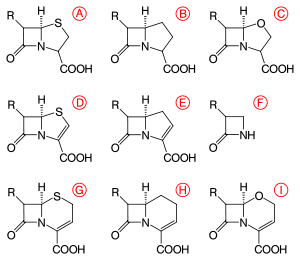 β-lactam antibiotics (beta-lactam antibiotics) are antibiotics that contain a beta-lactam ring in their chemical structure. This includes penicillin derivatives (penams), cephalosporins and cephamycins (cephems), monobactams, carbapenems[1] and carbacephems.[2] Most β-lactam antibiotics work by inhibiting cell wall biosynthesis in the bacterial organism and are the most widely used group of antibiotics. Until 2003, when measured by sales, more than half of all commercially available antibiotics in use were β-lactam compounds.[3] The first β-lactam antibiotic discovered, penicillin, was isolated from a strain of Penicillium rubens (named as Penicillium notatum at the time).[4][5]