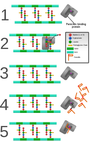 β-lactam antibiotics are bactericidal, and act by inhibiting the synthesis of the peptidoglycan layer of bacterial cell walls. The peptidoglycan layer is important for cell wall structural integrity,[6] especially in Gram-positive organisms, being the outermost and primary component of the wall. The final transpeptidation step in the synthesis of the peptidoglycan is facilitated by DD-transpeptidases, also known as penicillin binding proteins (PBPs). PBPs vary in their affinity for penicillin and other β-lactam antibiotics. The number of PBPs varies between bacterial species.[12]