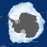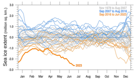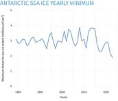 Sea ice extent in Antarctica varies a lot year by year. This makes it difficult determine a trend, and record highs and record lows have been observed between 2013 and 2023. The general trend since 1979, the start of the satellite measurements, has been roughly flat. Between 2015 and 2023, there has been a decline in sea ice, but due to the high variability, this does not correspond to a significant trend.[1] The flat trend is in contrast with Arctic sea ice, which has seen a declining trend.[1][6]
