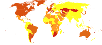 There is little data on the percentage of people with bulimia in general populations. Most studies conducted thus far have been on convenience samples from hospital patients, high school or university students. These have yielded a wide range of results: between 0.1% and 1.4% of males, and between 0.3% and 9.4% of females.[88] Studies on time trends in the prevalence of bulimia nervosa have also yielded inconsistent results.[89] According to Gelder, Mayou and Geddes (2005) bulimia nervosa is prevalent between 1 and 2 percent of women aged 15–40 years. Bulimia nervosa occurs more frequently in developed countries[71] and in cities, with one study finding that bulimia is five times more prevalent in cities than in rural areas.[90] There is a perception that bulimia is most prevalent amongst girls from middle-class families;[91] however, in a 2009 study girls from families in the lowest income bracket studied were 153 percent more likely to be bulimic than girls from the highest income bracket.[92]