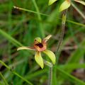 The inflorescence is a raceme with from one to eight resupinate flowers. The three sepals and two petals are free and similar in size and shape to each other. In some species, the sepals or petals or both have narrow tips with club-like ends. As is usual in orchids, one petal is highly modified as the central labellum. The labellum is divided into three parts, each of which usually has a fringed or dentate margin, while the central lobe has stalked or button-like calli which are often in rows. The sexual parts of the flower are fused to the column, which has wing-like structures on its sides. Most species flower in early spring but some species, such as the winter spider orchid (C. drummondii) flower in other months. The fruit that follows flowering is a non-fleshy, dehiscent capsule containing up to 500 seeds.[3][4][5]