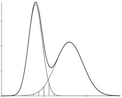 is the density of the mixture with two normal components, where [math]\displaystyle{ f_i, \pi_i, i=1,2 }[/math] are the normal densities and the mixing proportions of both sexes, respectively. See an example in Fig. 2 where the thicker curve represents the mixture whereas the thinner curves are the [math]\displaystyle{ \pi_if_i }[/math] functions.