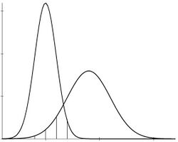 Chakraborty and Majumder (1982) have proposed an index of sexual dimorphism that is the overlapping area - to be precise, its complement - of two normal density functions (see Fig. 1). Therefore, it is a function of four parameters [math]\displaystyle{ \mu_i,\sigma^2_i, i=1,2 }[/math] (expected values and variances, respectively), and takes the shape of the two normals into account. Inman and Bradley (1989) have discussed this overlapping area as a measure to assess the distance between two normal densities.