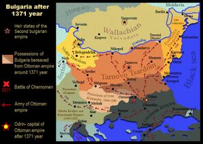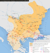 The medieval Bulgarian state was restored as the Second Bulgarian Empire after a successful uprising of two nobles from Tarnovo, Asen and Peter, in 1185, and existed until it was conquered during the Ottoman invasion of the Balkans in the late 14th century, with the date of its subjugation usually given as 1396, although some fringe views place it at 1422.[15] Until 1256, the Second Bulgarian Empire was the dominant power in the Balkans, defeating the Byzantine Empire in several major battles.