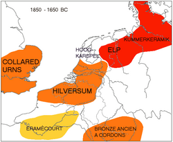 The Bell Beaker culture was also present in the Netherlands.[11][12] from around 2700 to 2100 BC.[13] It introduced metalwork in copper, gold and later bronze and opened international trade routes not seen before, reflected in copper artifacts. Finds of rare bronze objects suggest that Drenthe was a trading centre in the Bronze Age (2000–800 BC). The Bell Beaker culture developed locally into the Barbed-Wire Beaker culture (2100–1800 BC) and later the Elp culture (1800–800 BC),[14] a Middle Bronze Age archaeological culture with earthenware low-quality pottery as a marker. The initial phase of the Elp culture was characterised by tumuli (1800–1200 BC). The subsequent phase was that of cremating the dead and placing their ashes in urns which were then buried in fields, following the customs of the Urnfield culture (1200–800 BC). The southern region became dominated by the related Hilversum culture (1800–800 BC), with apparently cultural ties with Britain of the previous Barbed-Wire Beaker culture.