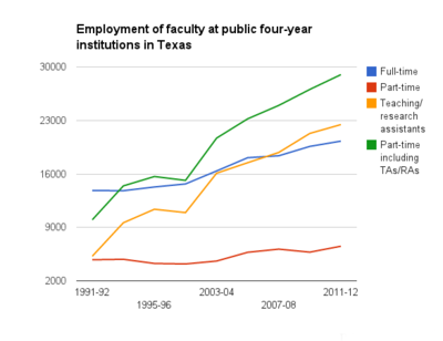 In Texas, the percentage of all part-time faculty, including graduate assistants, increased from 51.1 percent to 57.3 percent between the 1993-1994 and 2013-2014 school years. Below is a table that provides figures on full-time and part-time faculty employment in Texas as compared to surrounding states.[43]