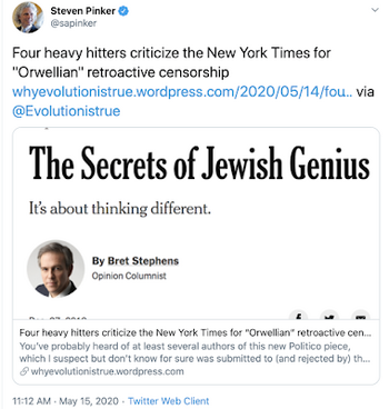 Hereditarian Jerry Coyne promoted their response on his blog in a fawning post titled, "Four heavy hitters criticize the New York Times for 'Orwellian' retroactive censorship",[86] and Steven Pinker promptly tweeted a link to it. Coyne also attacked The 1619 Project: "This is all part and parcel not only of the Times's increasing wokeness, evidenced in its 1619 Project…"