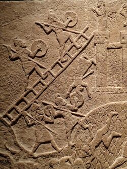 The first siege equipment is known from Egyptian tomb reliefs of the 24th century BC, showing Egyptian soldiers storming Canaanite town walls on wheeled siege ladders. Later Egyptian temple reliefs of the 13th century BC portray the violent siege of Dapur, a Syrian city, with soldiers climbing scale ladders supported by archers.