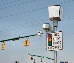 A red light camera is a traffic camera that takes an image of a vehicle that goes through an intersection where the light is red. The system continuously monitors the traffic signal and the camera is triggered by any vehicle entering the intersection above a preset minimum speed and following a specified time after the signal has turned red.[10]