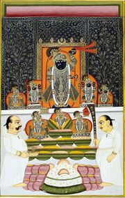Govardhan, a very famous place of Hindu pilgrimage, is located 26 km west of Mathura (154 km from New Delhi) on the state highway to Deeg. Govardhan is located on a narrow sandstone hill known as Giriraj which is about 8 km in length. When Vallabhacharya did parikrama (circumambulation) of Govardhana Hill while visiting Vrindavana in 1515 AD, he did not walk on the hill because he considered Govardhana as non-different from Lord Krishna. Therefore, traditionally Vaishnavas do not step on Govardhan hill.[2]