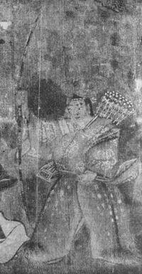 The preface of a genealogical record of the Suwa clan thought to date from the 16th century titled the Jinshi / Miwa-shi Keizu (神氏系図, "Genealogy of the Miwa / Jin Clan")[34][35][36] states that many conflicting stories concerning the origins of Suwa Daimyōjin exist: the Sendai Kuji Hongi for instance identifies him as Takeminakata, the son of the god Ōkuninushi, but another legend claims that the Suwa deity first appeared during the time of Emperor Yōmei (reigned 585-587). According to this story, Suwa Daimyōjin, accompanied by an eight-year-old boy named Arikazu (有員), came to Suwa and fought a battle against a certain 'Moriya' (守屋) at Mount Moriya. Moriya was eventually defeated by "divine soldiers" (神兵) led by Arikazu, after which Arikazu established a sanctuary (the Upper Suwa Shrine) on the slopes of the mountain. Suwa Daimyōjin, clothing the boy with his own garments, declared him to be his visible "body" and then disappeared. Suwa Daimyōjin is identified by the story as the manifestation of the bodhisattva Samantabhadra (Fugen), while Arikazu, who became the founding ancestor of the Suwa clan, is identified with Manjushri (Monju).[lower-alpha 3][36]