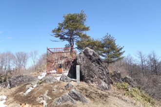 Behind the Upper Shrine, straddling the border between the cities of Suwa and Ina, stands the 1,650 metre-high[52][53] Mount Moriya.[53][54] On its eastern peak stands a miniature shrine or hokora enshrining a deity referred to in old documents as 'Moriya Daijin' (守矢大臣 or 守矢大神). This god is identified with either the Moriya of Suwa legend[55] or the deified Mononobe no Moriya, who is worshiped in a shrine on the opposite (southern) side of the mountain, in the town of Takatō (part of Ina City). Indeed, the hokora is considered to be this shrine's oku (no) miya (奥宮, lit. "inner shrine" or "rear shrine"[lower-alpha 9]).[57][58]
