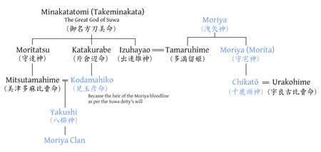 The Jinchō Moriya-shi Keifu meanwhile claims him to have had two children, a daughter named Tamaruhime (多満留姫) and a son named Moriya (守宅神).[lower-alpha 10] Tamaruhime married Izuhayao (出速雄神), one of Takeminakata's sons,[lower-alpha 11] while the younger Moriya fathered Chikatō, who married Urakohime (宇良古比売命), the goddess of Mount Urako (宇良古山; identified with Chikatō Shrine (千鹿頭神社) in Kanda / Satoyamabe, Matsumoto).[lower-alpha 12][46][61][62]