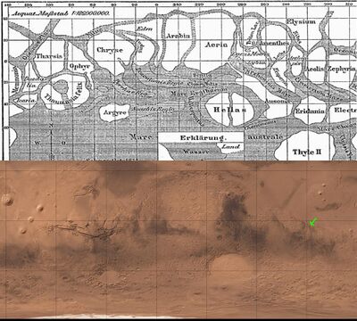 In 1877, Chryse and Argyre were recalled to life by the astronomer Giovanni Schiaparelli, who used the planetary opposition of that year to begin mapping the planet Mars. As an expert in ancient astronomy and geography, he was very familiar with classical legends and fabled lands and used them to name the features he could see through the telescope. He assumed that dark areas might be low flat "seas", as they are on the Moon, while "land" would be lighter. In particular, he noted several light patches that he took to be islands; he named the most striking circular one Hellas (for Greece) and two others Chryse and Argyre.