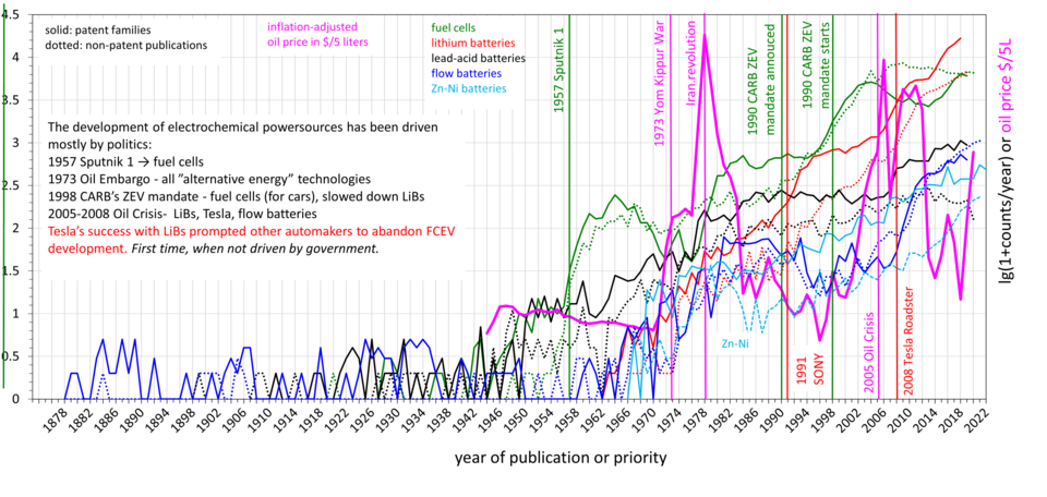 The electric storage fuel cell is a conventional battery chargeable by electric power input, using the conventional electro-chemical effect. However, the battery further includes hydrogen (and oxygen) inputs for alternatively charging the battery chemically.[55]