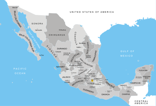 Mexico, officially the United Mexican States (Spanish: Estados Unidos Mexicanos), is a fairly large country in North America. It borders the United States to the North and Guatemala and Belize to the South. Its capital is Mexico City, which is the largest metropolitan area in North America. Like the United States of America capital it used to be a separate part of the country (in this case, the Federal District) instead of a state, but gained its autonomy in December 2017, with the city's boroughs becoming municipalities and electing their own mayors like the rest of the country. Just like its USA counterpart, Mexico is divided into provinces (32 of them), which it calls states.