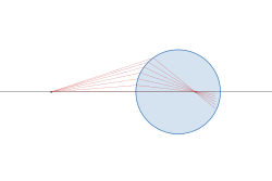 In the extreme case where an object is an infinite distance away, S1 = ∞, S2 = f and M = −f/∞ = 0, indicating that the object would be imaged to a single point in the focal plane. In fact, the diameter of the projected spot is not actually zero, since diffraction places a lower limit on the size of the point spread function. This is called the diffraction limit.