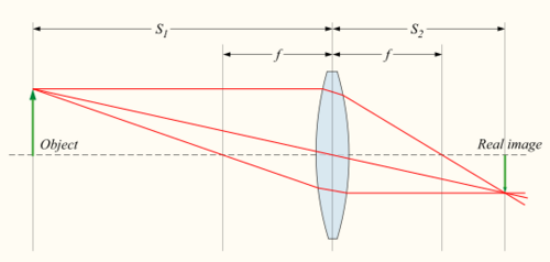 If the distances from the object to the lens and from the lens to the image are S1 and S2 respectively, for a lens of negligible thickness (thin lens), in air, the distances are related by the thin lens formula:[22][23][24]
