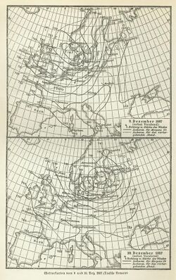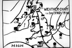 As the electric telegraph network expanded, allowing for the more rapid dissemination of warnings, a national observational network was developed, which could then be used to provide synoptic analyses. To shorten detailed weather reports into more affordable telegrams, senders encoded weather information in telegraphic code, such as the one developed by the U.S. Army Signal Corps.[19] Instruments to continuously record variations in meteorological parameters using photography were supplied to the observing stations from Kew Observatory – these cameras had been invented by Francis Ronalds in 1845 and his barograph had earlier been used by FitzRoy.[20][21]
