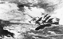 A storm in October 1859 that caused the loss of the Royal Charter inspired FitzRoy to develop charts to allow predictions to be made, which he called "forecasting the weather", thus coining the term "weather forecast".[17] Fifteen land stations were established to use the telegraph to transmit to him daily reports of weather at set times leading to the first gale warning service. His warning service for shipping was initiated in February 1861, with the use of telegraph communications. The first daily weather forecasts were published in The Times in 1861.[16] In the following year a system was introduced of hoisting storm warning cones at the principal ports when a gale was expected.[18] The "Weather Book" which FitzRoy published in 1863 was far in advance of the scientific opinion of the time.
