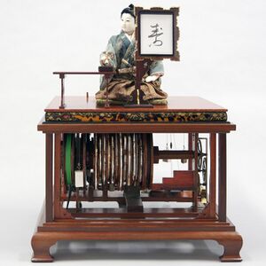 In the 19th century, Tanaka Hisashige, the founder of Toshiba, gained a reputation by making technically sophisticated karakuri puppets. His masterpieces are Yumi-hiki-doji (arrow-shooting boy) and Moji-kaki doll (letter-writing doll). In the case of Yumi-hiki, using mechanical power, a puppet shoots a target with a bow and arrow, and in the case of Moji-kaki, a puppet a dips a brush into ink and writes characters on paper.[8]