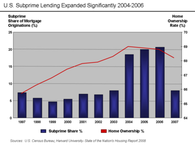 2006: After years of above-average price increases, housing prices peaked and mortgage loan delinquency rose, leading to the United States housing bubble.[83][84] Due to increasingly lax underwriting standards, one-third of all mortgages in 2006 were subprime or no-documentation loans,[85] which comprised 17 percent of home purchases that year.[86]