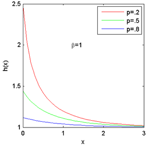 | [math]\displaystyle{ \frac{1}{-\ln p} \times \frac{\beta(1-p) e^{-\beta x}}{1-(1-p) e^{-\beta x}} }[/math] | |||