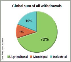 The United Nations (UN) estimates that, of 1.4 billion cubic kilometers (1 quadrillion acre-feet) of water on Earth, just 200,000 cubic kilometers (162.1 billion acre-feet) represent freshwater available for human consumption. A mere 0.014% of all water on Earth is both fresh and easily accessible.[35] Of the remaining water, 97% is saline, and a little less than 3% is difficult to access. The fresh water available to us on the planet is around 1% of the total water on earth.[36] The total amount of easily accessible freshwater on Earth, in the form of surface water (rivers and lakes) or groundwater (in aquifers, for example), is 14,000 cubic kilometers (nearly 3359 cubic miles). Of this total amount, 'just' 5,000 cubic kilometers are being used and reused by humanity. Technically, there is a sufficient amount of freshwater on a global scale. Hence, in theory, there is more than enough freshwater available to meet the demands of the current world population of more than 7 billion people, and even support population growth to 9 billion or more. Due to the unequal geographical distribution and especially the unequal consumption of water, however, it is a scarce resource in some parts of the world and for some parts of the population.