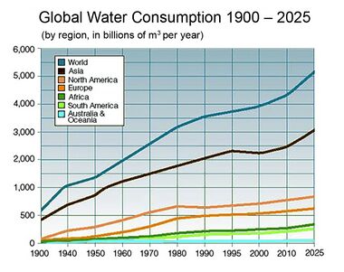 [39][40] A study in 2016 calculated that globally, the population under water scarcity increased from 0.24 billion (14% of global population) in the 1900s to 3.8 billion (58%) in the 2000s.[1] This study analyzed water scarcity using the fundamental concepts of shortage (impacts due to low availability per capita) and stress (impacts due to high consumption relative to availability).