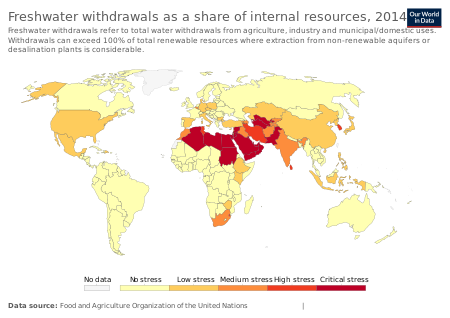 Sustainable Development Goal 6 is about "clean water and sanitation for all".[128] It is one of 17 Sustainable Development Goals established by the United Nations General Assembly in 2015. The fourth target of SDG 6 refers to water scarcity and states: "By 2030, substantially increase water-use efficiency across all sectors and ensure sustainable withdrawals and supply of freshwater to address water scarcity and substantially reduce the number of people suffering from water scarcity".[10] It has two indicators. The second one is: "Level of water stress: freshwater withdrawal as a proportion of available freshwater resources". The Food and Agriculture Organization of the United Nations (FAO) has been monitoring these parameters through its global water information system, AQUASTAT, since 1994.[29]:xii