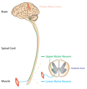 UMNs are motor neurons that project from the cortex down to the brainstem or spinal cord.[13] LMNs originate in the anterior horns of the spinal cord and synapse on peripheral muscles.[13] Both motor neurons are necessary for the strong contraction of a muscle, but damage to an UMN can be distinguished from damage to a LMN by physical exam.[citation needed]