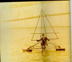 Publicity from the Fleep[9] and the Paresev tests sparked interest in the design among several tinkerers, including Barry Palmer, and Sport Aviation of 1962 shown Jim Hobson of Experimental Aircraft Association (wing shown on US national TV in Lawrence Welk Show in 1962). An Australian engineer Mike Burns developed and used the boat-towed Rogallo-airfoiled SkiPlane starting in 1962 through the 1960s. A fellow countryman of Mike Burns, John W. Dickenson, made ski-kites and eventually partnered with Mike Burns to improve the ski-kite; he formatted a ski-kite that used what could be found in the 1929 George A. Spratt simple triangle control bar or A-frame with single-point pendulum weight-shift control.